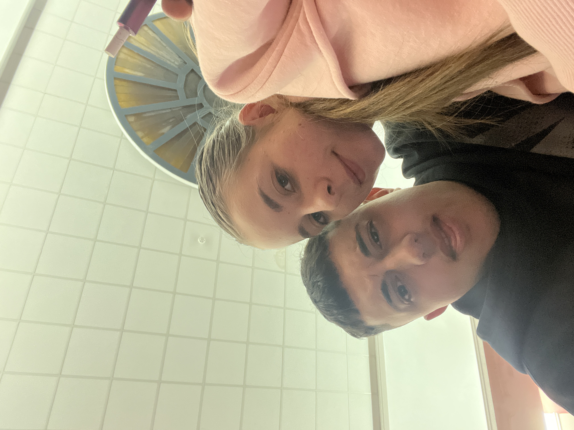 Two individuals, one female and one male, are positioned close together, possibly in a selfie. The female is wearing a light pink hooded sweatshirt and has blonde hair, and the male is wearing a dark colored sweatshirt. They are in an indoor environment with white tiled walls and a circular vent or light fixture on the ceiling. The location is potentially a public restroom based on the tiling and fixtures. There are no identifiable landmarks in the image to definitively place it in Nova Zagora, Bulgaria, but the presence of tiled walls and a circular light fixture suggests an interior space, potentially a restroom or similar utility area. The action is most likely taking a photo or video.
