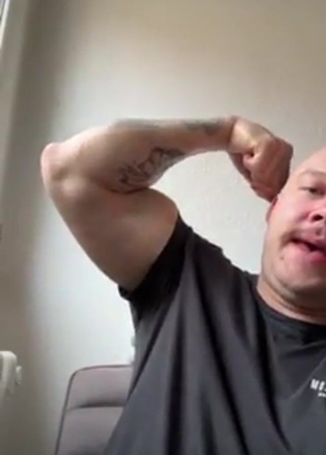 A man is flexing his left bicep. He is seated in front of a white wall and next to a gray chair. He is wearing a black t-shirt and has a tattoo on his left forearm. He has a mustache.