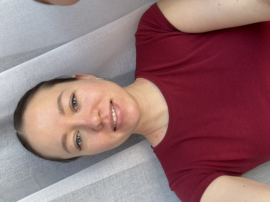 An adult female, situated in Gamovo, Russia, is depicted in a close-up, chest-up shot, looking directly at the camera with a slight smile. She has fair skin with visible freckles and areas of redness on her cheeks and nose. Her eyes are blue-green, and her light brown hair is pulled back from her face. Small, silver-colored hoop earrings are present in her ears. A thin, silver-colored chain necklace is visible around her neck, which also shows some redness. She is wearing a plain, dark red, short-sleeved t-shirt with a rounded neckline. The background consists of draped, light-colored, translucent fabric, likely curtains, exhibiting soft vertical folds. A small, out-of-focus portion of another individual's head is partially visible in the upper right corner of the frame.