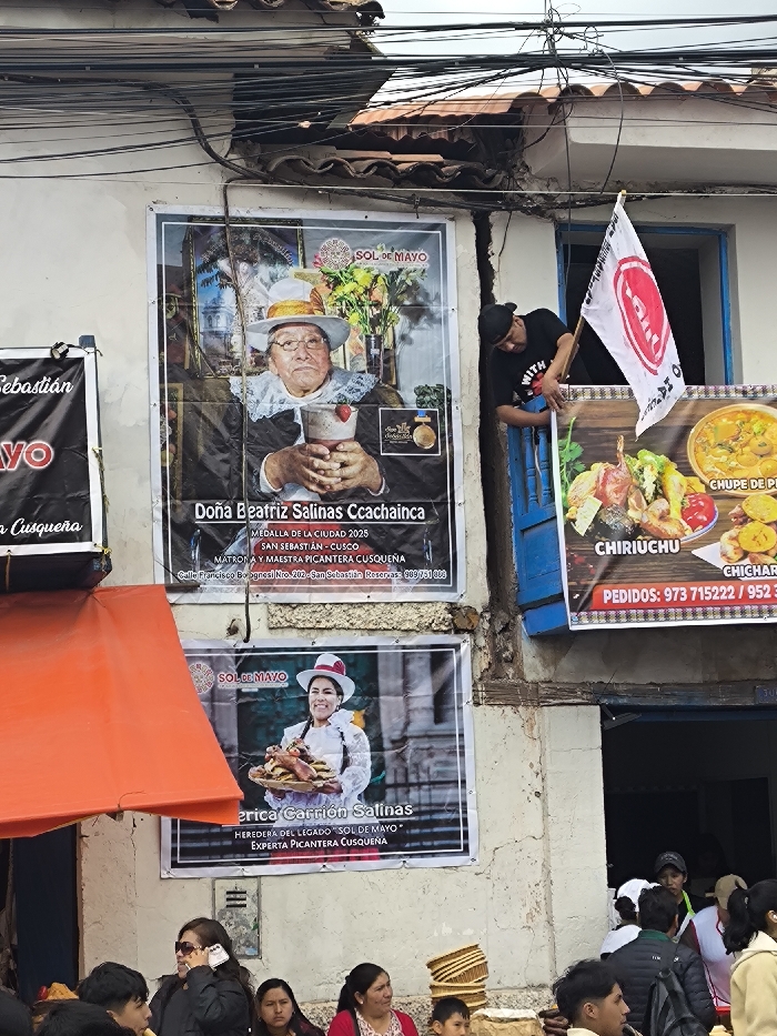 Two posters promote "Sol de Mayo" and feature portraits of Doña Beatriz Salinas Ccachainca and Erica Carrión Salinas, both described as experts in Cusqueña cuisine. Doña Beatriz is labeled as "Medalla de la Ciudad 2025." The restaurant is in San Sebastián, Cusco. A smaller poster advertises "Chiriuchu" and "Chuque de Pi," offering take-out orders. A man hangs a white flag with a red logo from an open window above the restaurant. People are gathered around in front of the building.