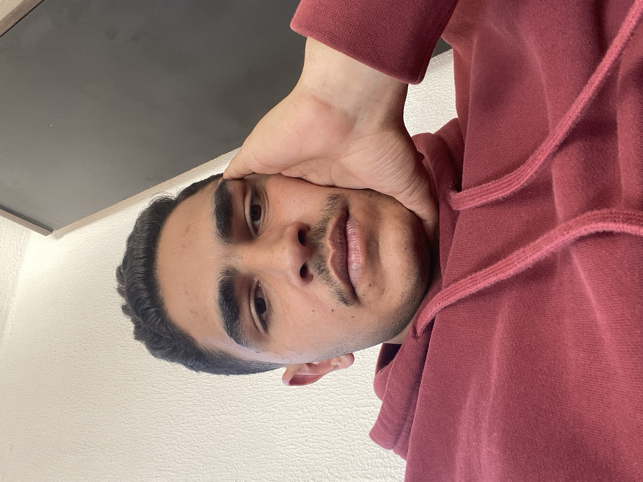 A young adult male is depicted in a close-up, head-and-shoulders shot, situated in Dahiyat Harasta, Syria. He possesses dark, neatly styled hair, thick dark eyebrows, and a distinct mustache. His expression is neutral as he looks directly forward, with his right hand resting against the right side of his jawline and cheek, providing a slight support to his head. He is attired in a maroon-colored hooded sweatshirt featuring visible drawstrings around the neck. The background consists of a light-colored, textured wall on the left side of the frame, and a dark, possibly black or charcoal gray, rectangular object with a dark border on the right. The scene suggests an indoor environment under even lighting. No other individuals or notable actions are present.