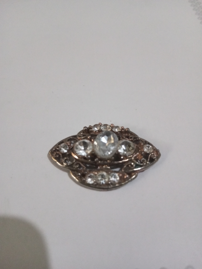 An ornate, eye-shaped metallic brooch is positioned centrally on a plain white surface