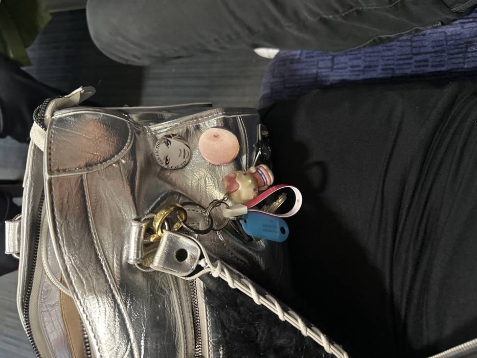 A high-angle, close-up photograph depicts a silver metallic handbag resting on an individual's lap, primarily covering the lower-left and central frame. The handbag's crinkled texture and zippered compartments are visible. Attached to the handbag are two circular pins: one featuring a stylized black and white image of a woman's face with the text "FAN FICTION," and another depicting a light pink nipple and areola. A set of keychains hangs from a gold-colored clasp on the handbag, including a blue rectangular plastic fob, a metal key, and a "Hello Kitty" figurine keychain dressed in pink and blue. The individual supporting the handbag is wearing dark, possibly black, attire. To the right, part of another individual's leg is visible, clad in dark trousers or jeans, with a white shoe or sneaker partially discernible at the far right. A patterned blue fabric, consistent with upholstered seating in a public transport vehicle or waiting area, is visible beneath the second individual's leg. The scene is indoors. No specific identifying geographical features are present to determine the exact location within Tonbridge and Malling, United Kingdom.