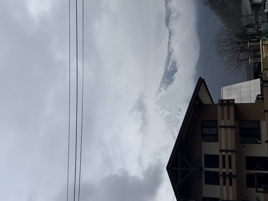 The image depicts a two-story residential or commercial building in the foreground, situated in Krasnaya Polyana, Russia. The structure features a brown facade with horizontal siding on the upper story and lighter stucco on the lower story. A prominent dark brown gable roof with visible timber framing is at the top. The upper story includes a balcony with a light brown and dark brown railing. Multiple dark-framed windows and doors are visible on both levels. In the mid-ground and background, snow-capped mountains are partially obscured by dense clouds and fog. Coniferous trees are visible on the lower slopes of the mountains, with bare deciduous trees in the immediate vicinity of the buildings. The sky is overcast with a uniform gray cloud cover. Three parallel utility lines traverse the upper portion of the frame horizontally. To the right of the main building, another structure with a corrugated roof is partially visible, along with what appears to be a yellow and green sign with the numbers "2248" on it. No individuals are present in the scene. The overall environment suggests a mountainous region with developed infrastructure, likely a resort town setting given the architectural style and mountainous backdrop.