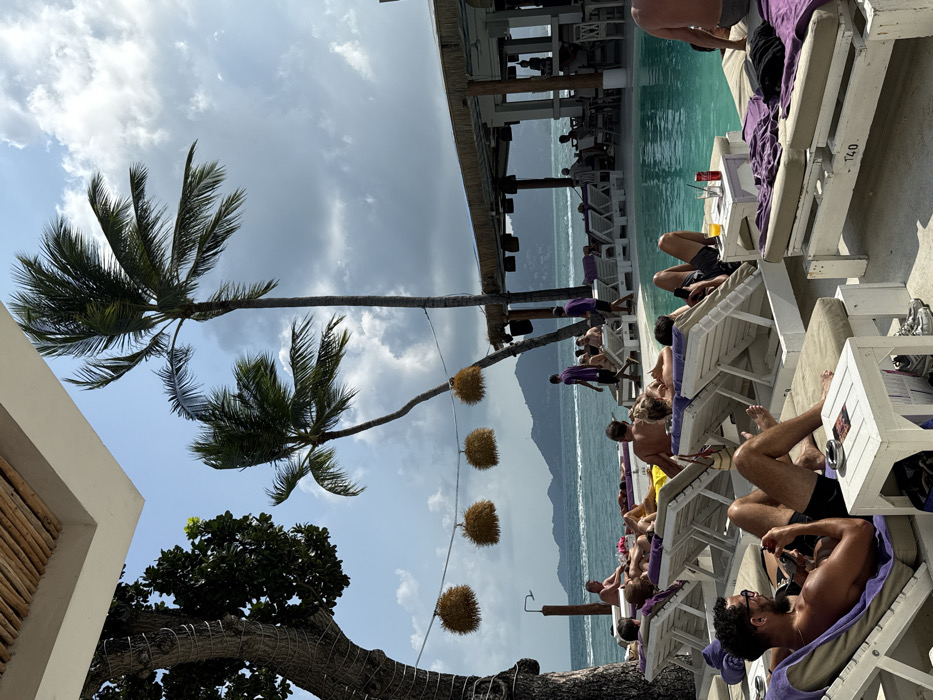 The image depicts an outdoor leisure area in Ban Bang Rak, Thailand. The scene features a resort or beach club setting under a partly cloudy sky, with bright daylight casting distinct shadows. In the foreground and mid-ground, a turquoise swimming pool is surrounded by a white concrete patio. Numerous individuals, predominantly adults, are observed relaxing on white wooden lounge chairs, many with beige or purple cushions. Most are reclining; some are sunbathing, while others are engaging with mobile phones. Specific individuals include a male with dark hair and a beard in black swim shorts, holding a dark object, with an ashtray on an adjacent white side table. Another person is visible with an orange drink and a Coca-Cola can on a side table. Attire visible on individuals consists of swim shorts and tops. Above the pool area, a string of four spherical, woven straw or rattan light fixtures is suspended. Two tall palm trees stand prominently, one leaning significantly, with their fronds visible against the sky. A large tree with string lights wrapped around its trunk is situated on the far left. The background reveals an open-air bar or restaurant structure with a thatched roof and white pillars, where several patrons are seated. Two individuals in purple uniforms, presumably staff, are observed walking near the pool's edge by the bar. Beyond the resort structures, the calm, blue-green ocean extends to distant hilly landmasses or islands. A white outdoor shower fixture is visible near the water's edge on the left. The sky shows a mix of clear blue and significant grey cloud cover.