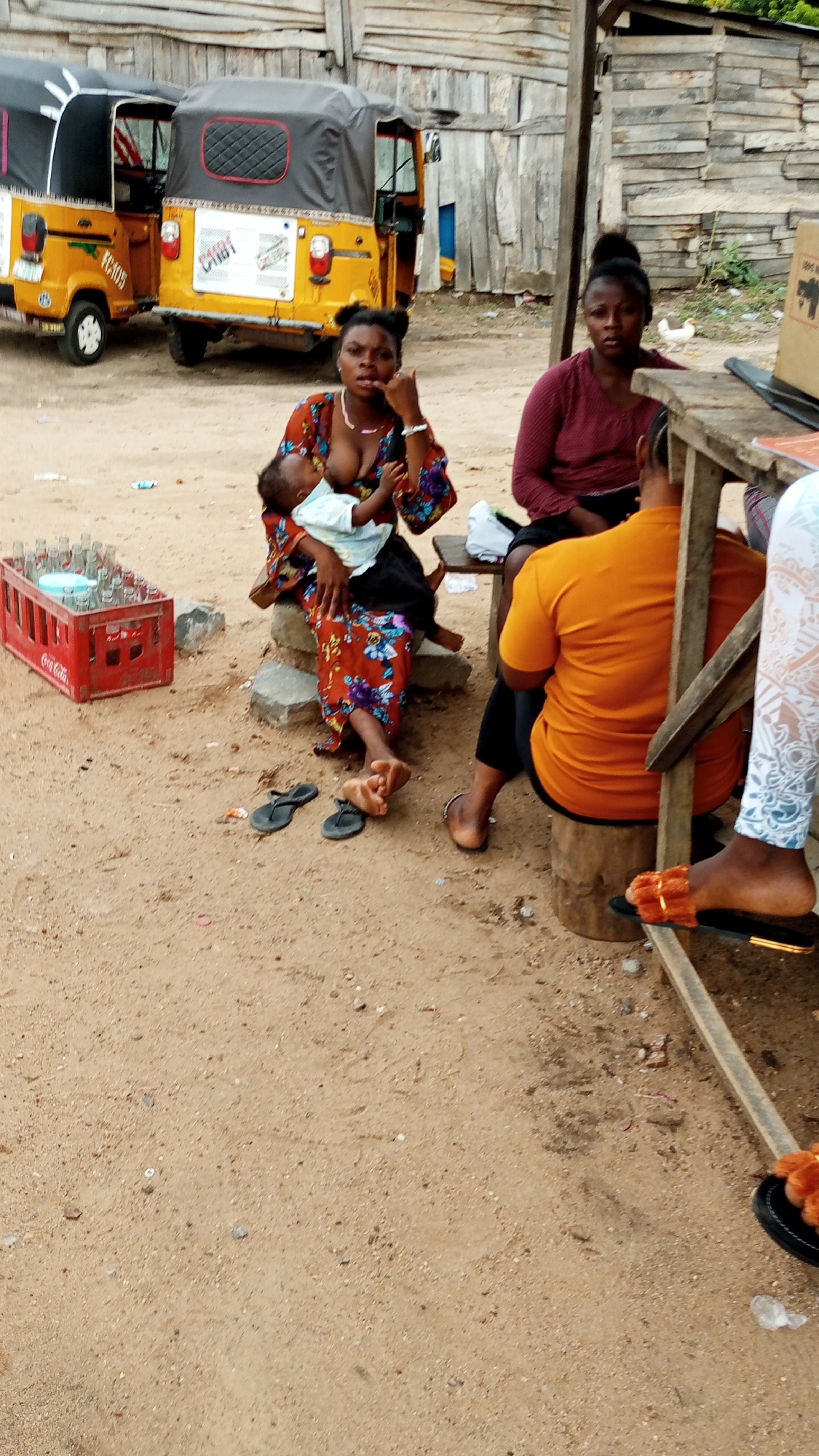 The image, taken in Zango-ndaji, Nigeria, shows three women sitting outside on a sandy lot. One woman is breastfeeding a baby. A red Coca-Cola crate filled with glass bottles sits nearby. Two yellow auto rickshaws (tuk-tuks) are parked in the background near wooden structures.