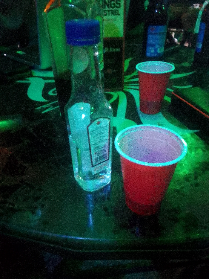 A dimly lit indoor scene, likely a bar or nightclub, is captured from a slightly elevated perspective. The environment is predominantly illuminated by green light, which reflects off a dark, glossy surface, possibly a table, creating intricate green patterns and highlights. In the center of the image, a clear glass bottle with a distinctive blue plastic cap stands upright. The bottle contains a clear liquid and has a white rectangular label with black text visible on its side. To the right of this bottle, two red plastic cups, commonly known as Solo cups, are present. The cup in the foreground is more prominent and contains a translucent, light-colored liquid. The second red cup, further back, also appears to contain liquid. In the blurred background, several other bottles are discernible. One bottle features a green label with the text "KINGS STREL" in white lettering, suggesting an alcoholic beverage. Another dark bottle is partially visible behind the main clear bottle. No individuals are present or visible in the frame. The arrangement of bottles and cups indicates a social gathering where beverages are being prepared or consumed in the city of Unknown, Unknown.