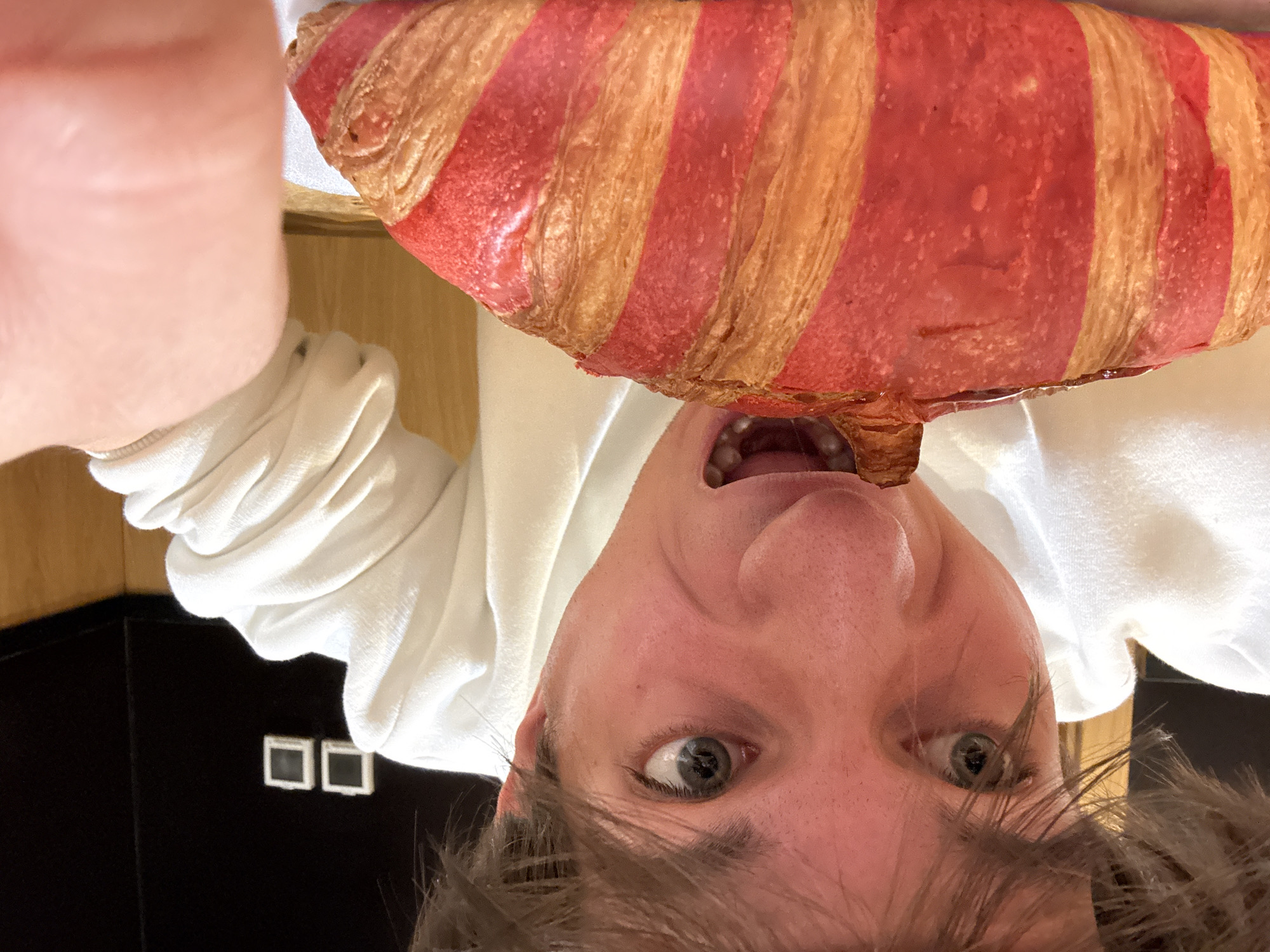 A distorted, upside-down selfie captures a fair-skinned individual, likely a young male, holding a red and golden striped croissant above their head