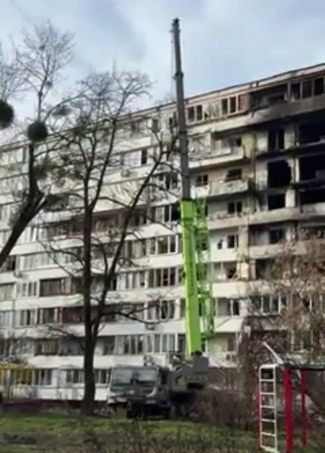 building with significant fire damage. The upper floors, specifically the right side of the building, are blackened and have large holes in the facade. A crane with a green boom stands in front of the building, likely involved in repair or assessment work. Bare trees are positioned between the camera and the building, obscuring the view. A playground with red supports is visible in the lower right corner. A person wearing a yellow jacket appears to be standing near the crane. The sky is overcast.