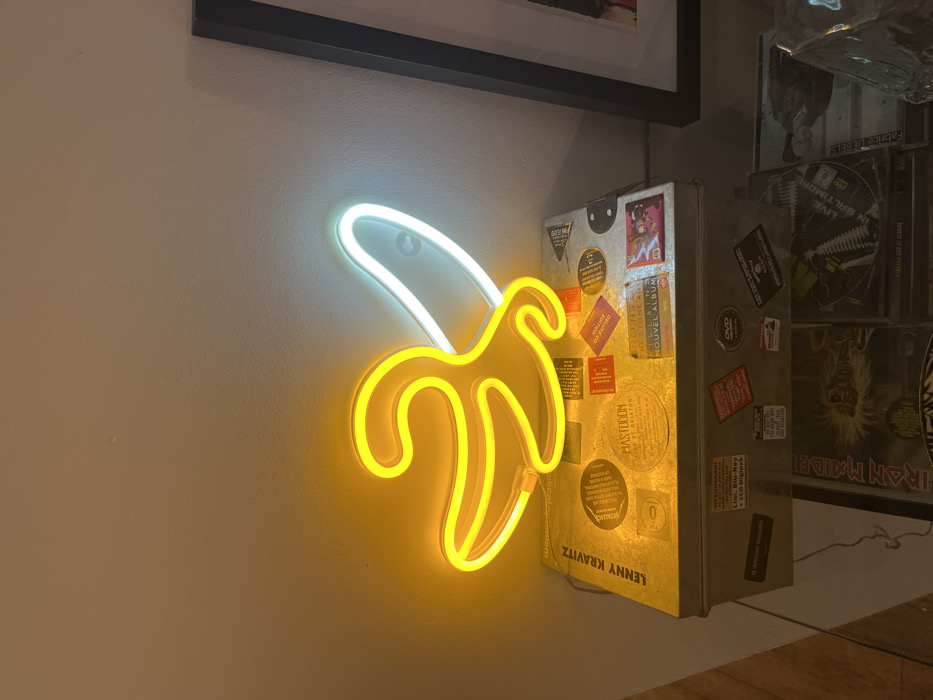 This image captures an indoor scene in the city of Roubaix, France, centered on a luminous neon sign and personal effects. The primary subject is a wall-mounted neon sign shaped like a peeled banana, with the banana's fruit section glowing bright yellow-orange and the peel section emitting a light blue-white hue. Below the neon sign, a rectangular, galvanized metal container or box is situated. Its top and front surfaces are heavily adorned with assorted stickers. Identifiable stickers include "LENNY KRAVITZ," "MASTODON," "DELUXE CD EDITION," and "NOUVEL ALBUM" (French for "New Album") on the top. The front displays "MESHUGGAH Lim. Blu-Ray + 2CD DigiPak" and a "DVD" label, alongside other warning and informational stickers in both French and English. This metal container rests on a transparent surface, likely a glass shelf, partially visible on the left. Below this shelf, a stack of physical media, primarily CD or DVD cases, is discernible. Prominent among these is a case featuring the "IRON MAIDEN" logo, and another with "LIVE IN BALTIMORE" printed on it. To the right of the stack, a translucent, crystalline object is partially visible. The background consists of a plain, light-colored wall, with a black-framed item partially visible on the far right. No individuals are present in the scene.