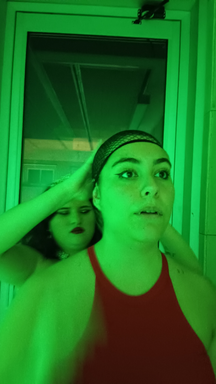 The image depicts two females within an interior setting, saturated entirely by a prominent green light source