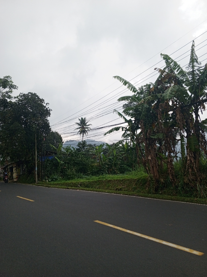 The image displays a roadside scene under an overcast sky, purportedly in Qorday, Kazakhstan. A two-lane asphalt road with segmented yellow center lines runs through the foreground and midground. On the left side of the road, a dense, dark green tree stands beside a small, weathered structure with a partially visible corrugated roof. A person on a dark motorcycle is observed traveling away from the viewer on the left lane of the road, near this structure. The right side of the road features a grassy verge leading to abundant green vegetation, including multiple banana trees with large, tattered leaves. In the midground, a prominent palm tree is visible amidst the foliage, with distant mountains or hills rising in the background. Several dark utility lines stretch horizontally across the upper portion of the frame, set against a uniformly light gray, cloudy sky.
