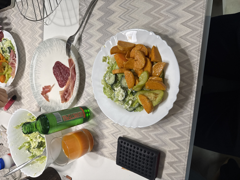 The image displays a dining table setup in the city of Lozenets, Bulgaria, viewed from above. The table is white and partially covered by a light grey placemat featuring a white chevron pattern. In the foreground, a white fluted plate holds a meal divided into two sections: the left half contains sliced green vegetables, possibly zucchini or cucumber, mixed with lettuce and a white creamy dressing or cheese; the right half contains sliced, cooked orange root vegetables, consistent with sweet potatoes. To the immediate left of this plate, a black, textured rectangular object, resembling a wallet or phone case with a studded surface, rests partially open on the placemat, revealing a reddish-brown interior. Adjacent to this, a clear glass holds an orange liquid, likely juice. Standing upright next to the glass is a green glass bottle with a white label featuring the Cyrillic text "ПЕЛИСТЕРКА". Further back, a white plate with a grey patterned rim displays an assortment of cured meats, specifically sliced salami and prosciutto. A silver fork lies on the placemat to the right of this plate. In the background, a large white bowl contains a green salad with a silver serving spoon, and another partially consumed plate of food is visible. A small blue and white bottle and a pink marker are also present in the background. A human hand is visible holding the pink marker. A chrome wire rack is partially visible on the far right edge of the table. Below the table, in the bottom center of the frame, the upper thigh and knee of a person wearing black trousers are discernible. The scene depicts a casual meal in progress.