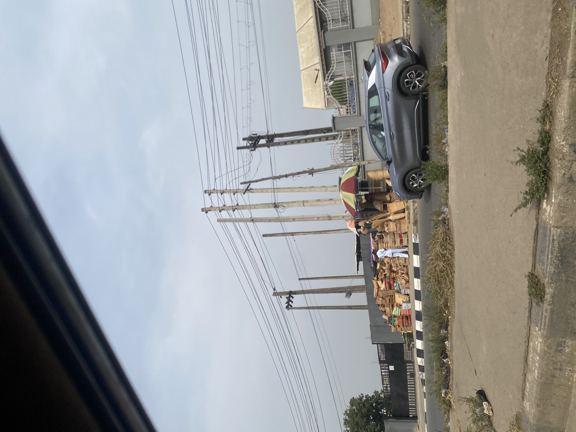 An urban street scene in Ikeja, Nigeria, captured from inside a moving vehicle, under an overcast or hazy sky. In the foreground, a concrete sidewalk and median strip are visible, with sparse vegetation and scattered refuse. A grey crossover SUV, identifiable as a BYD Atto 3 / Yuan Plus, travels rightward on an asphalt road. Adjacent to the road, on a paved shoulder, a street vendor's operation features a large, tall mound of woven baskets, brooms, and other artisanal goods. A single individual, dressed in light-colored long-sleeved attire, stands facing away from the camera, positioned next to the merchandise. A red and yellow striped umbrella partially covers the vendor's display. Behind the vendor stall and to the left, a dark grey wall and a black metal gate mark a property entrance. To the right, a grey concrete fence with decorative metalwork fronts a building with a light-colored roof. The background is dominated by multiple utility poles, both concrete and wooden, supporting a complex web of overhead wires against the light grey sky. A green tree is visible on the far left.