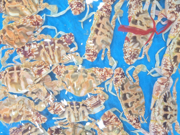 A top-down shot displays multiple crabs in a blue tank. These crabs have shells of mixed brown, tan, and white, with varied spot patterns. Some crabs are clustered together, while others are more isolated. The water creates subtle light distortions. A red string is tied around one of the crabs, adding a distinct detail.