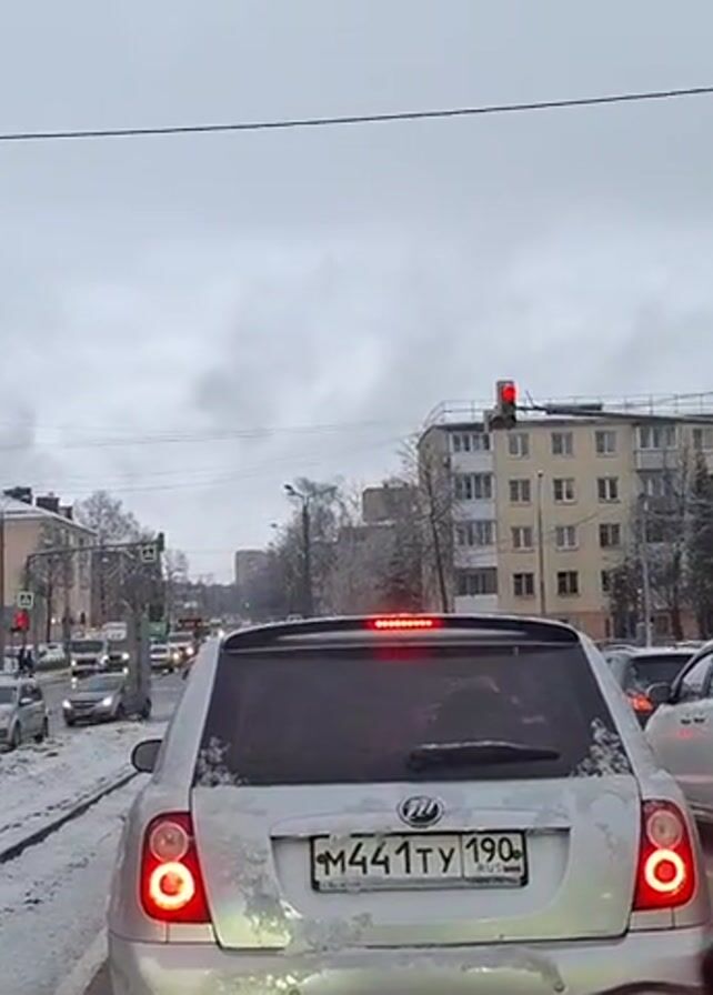 street scene on a cloudy day in what appears to be a city in Russia. The camera is positioned inside a car stuck in traffic, facing forward. The road is wet and partially covered with snow. Other cars are visible in front, to the side, and oncoming. Buildings line the street, with some having snow on their roofs. A street sign is visible on the right side of the road. A traffic light ahead is red.