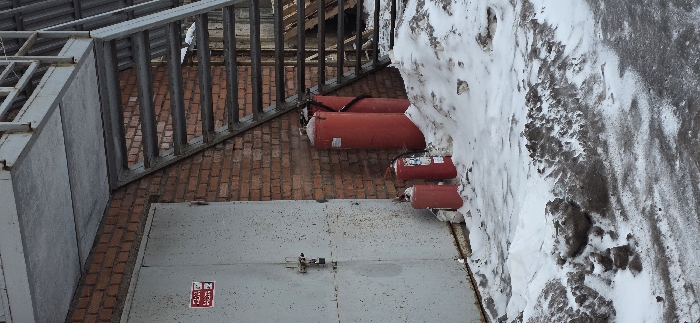 The scene depicts the exterior of an industrial or utility building in Saint Petersburg, Russia, during winter conditions. A large, light-grey, two-panel metal door, secured by a padlock and hasp, occupies the left side of the frame. A red warning sign with white text, partially visible, is affixed to the door. The door exhibits signs of wear and rust. To the right of the door, a red brick wall extends, against which an external, grey metal staircase ascends diagonally upwards to the right, featuring multiple steps and a landing. Four red fire extinguishers of various sizes are positioned on the ground at the base of the brick wall, partially covered by snow. Two smaller extinguishers are closer to the door, while two larger, taller ones are further right, beneath the staircase. The ground is covered with irregular mounds of snow and dirty ice, with patches of dark, wet asphalt visible in the foreground. No individuals or active interactions are present in the image.