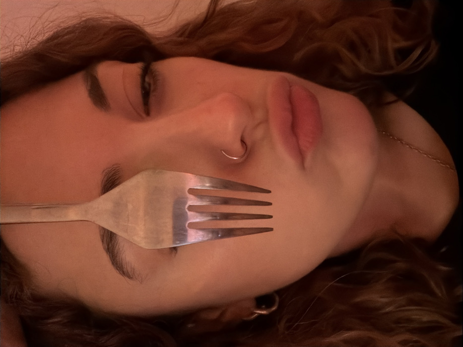 A woman lies on her back, with a fork obscuring her eyes. She has curly brown hair and fair skin. She has a nose ring. The fork appears to be silver. Her lips are pink. The lighting has a warm tint. Part of a gold necklace and gold earrings are visible.