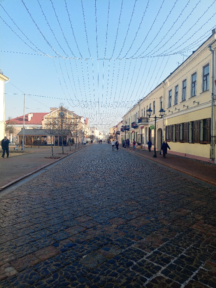 This image captures a longitudinal view of a cobblestone pedestrian street in Hrodna, Belarus, under a clear, light blue sky