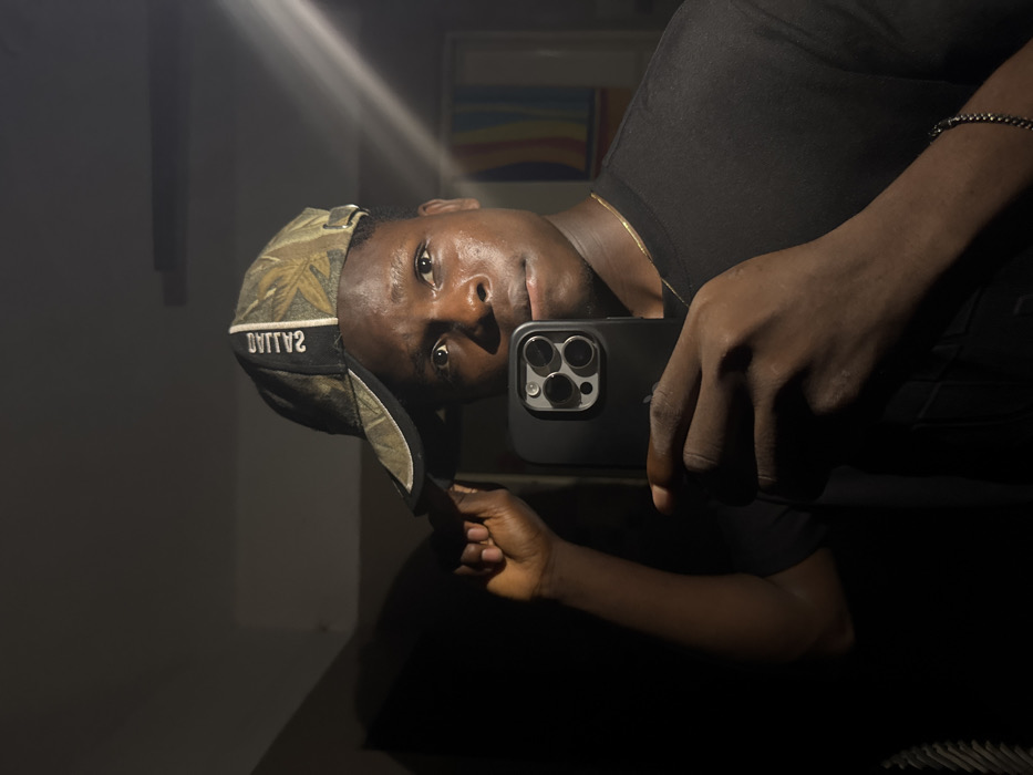 A person takes a mirror selfie, holding a phone with a triple-lens camera. They wear a camo baseball cap with mirrored text and a dark t-shirt. A gold chain is visible. The lighting is uneven, creating stark shadows. A bright beam shines from the upper left. A colorful artwork hangs faintly in the background. The phone's reflection obscures part of their face.
