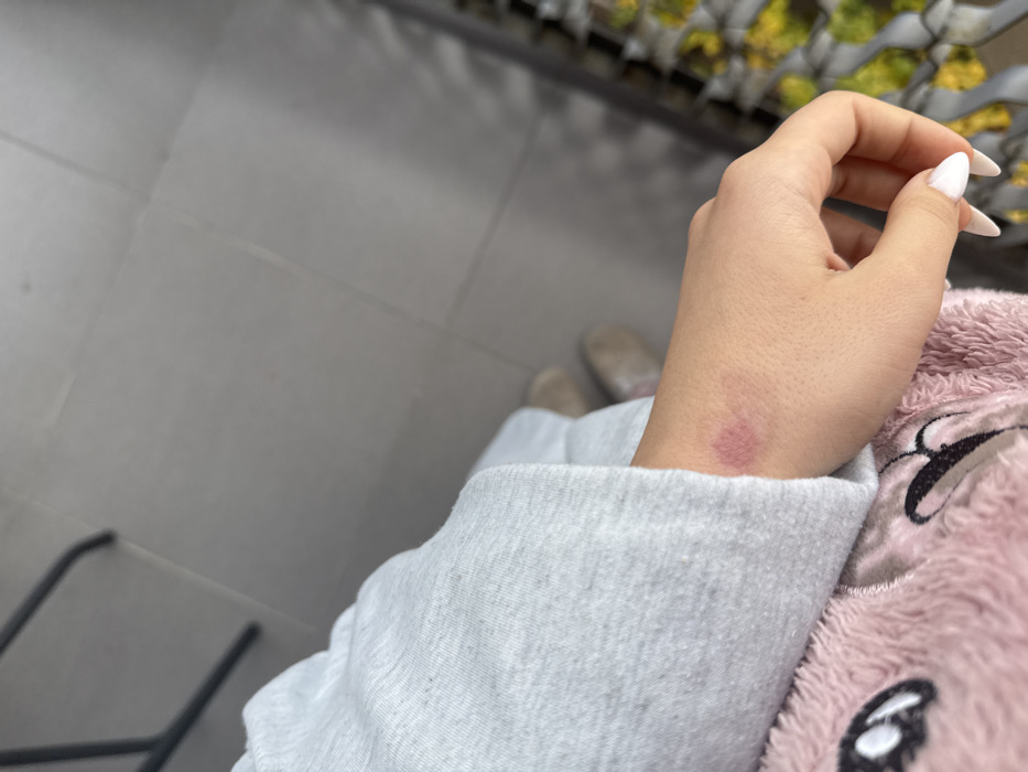 The image displays a close-up, top-down view of a person's left hand and lower forearm. A reddish-purple, irregularly shaped contusion or abrasion, approximately 2-3 cm in diameter, is visible on the dorsal side of the left wrist, proximal to the metacarpals. The hand has light-toned skin, and several fingernails are visible, painted white and shaped in a pointed style. The forearm is covered by a light grey, possibly heathered, long-sleeved garment. Beneath the arm, a portion of a pink, textured fabric, possibly fleece, with a dark graphic resembling a cartoon face is visible. The background shows a light-colored tiled floor with visible grout lines. In the mid-background, two feet wearing light-colored, closed-toe shoes are partially visible. To the right, a blurry, vertical metallic grid structure is present, containing indistinct yellowish-green objects, suggestive of produce or items on display in a commercial setting. A dark, blurred metallic object, possibly a furniture leg, is in the upper left background. The specific location within Tbilisi, Georgia, cannot be determined from the visual information provided.