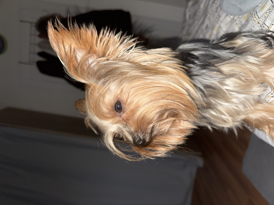 - "A Yorkshire Terrier, exhibiting a steel blue and tan coat with prominent erect ears and dark eyes, is depicted seated upright, facing left, within an indoor setting in Bischheim, France" by FM-MKghF3, licensed under CC BY 4.0