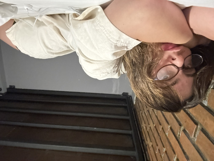 - "The image displays an individual, appearing female, with medium-brown hair and wearing dark-rimmed eyeglasses, lying prone on a white bedsheet" by FM-wUaYc2, licensed under CC BY 4.0
