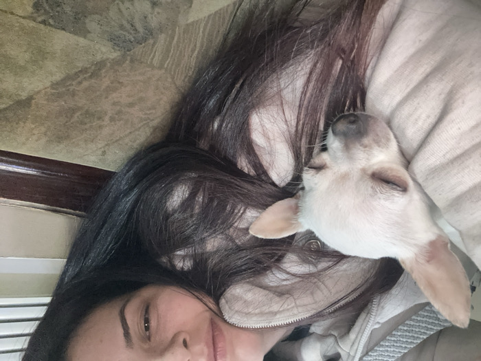 The image displays a close-up, angled view of a human female and a small dog in an indoor setting