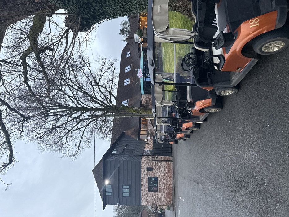 This image depicts an outdoor scene at the Old Thorns Manor Hotel & Golf Course in Griggs Green, Liphook, East Hampshire, United Kingdom, under an overcast sky. In the foreground, a line of at least seven orange and black golf carts with light-colored fabric roofs is parked on an asphalt surface. Visible cart numbers include 18, 22, and 4. To the left, a multi-story building features a red brick lower section and dark grey horizontal siding on its upper floors, with several windows and an illuminated exterior floodlight. A dark gate or door is visible adjacent to this building. In the background, a larger, multi-roofed building displays a prominent light blue sign with "Oties" in white script and features dormer windows on its dark roof. Green grass is visible between the golf carts and this background building. Bare deciduous trees are present, including a large one centrally positioned and another on the far right covered in ivy. No individuals are visible.