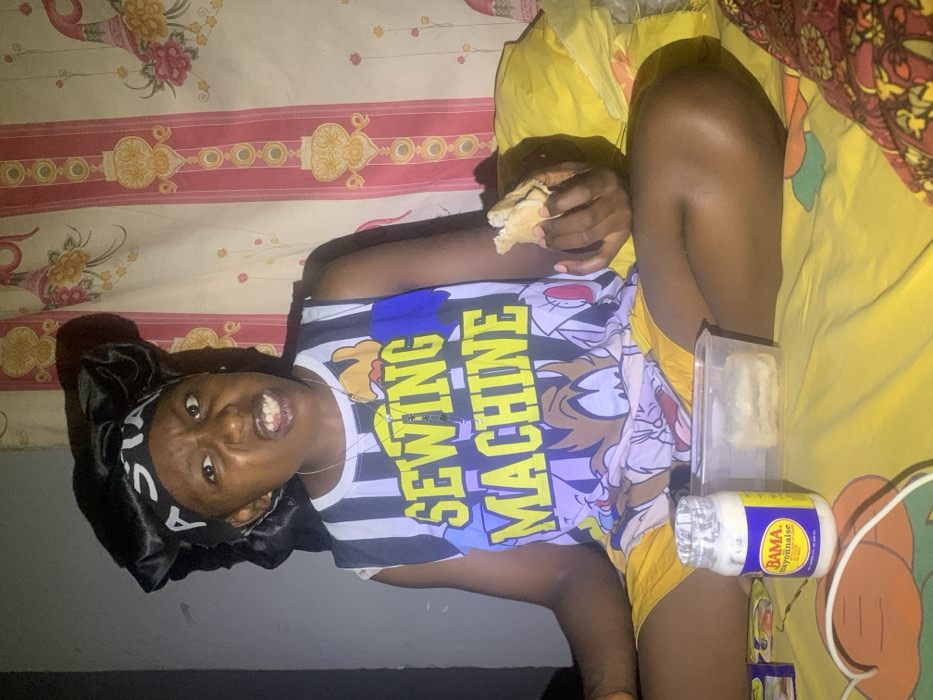 A young woman wearing a black satin bonnet and a cartoon-printed shirt lies on a yellow patterned bedspread. She eats a sandwich. Next to her is a container, a jar of Bama mayonnaise, and condiments. The background includes a bed with floral and geometric patterned sheets and a plain wall.
