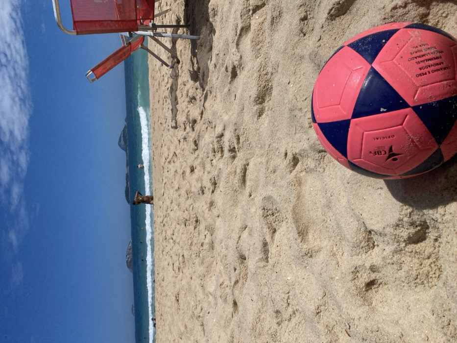 A beach scene features a vibrant pink and blue soccer ball resting on light sand. Partially visible is a red beach chair. In the background, a clear blue sky meets the ocean, where people can be seen enjoying the water. The beach is dotted with footprints.