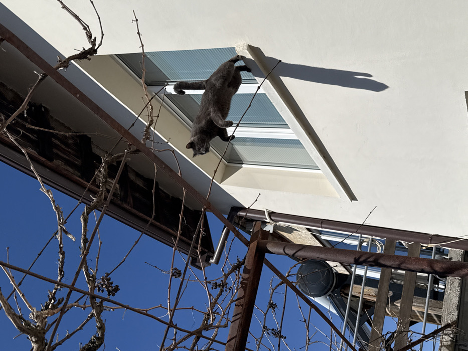 The scene depicts the exterior of a cream-colored building in Marchaevo, Bulgaria, under a clear blue sky with bright sunlight. A gray domestic cat is captured in motion, positioned against the building's facade. Its rear paws are on or just departing from a white window ledge, while its front paws are reaching towards or resting on a taut, thin horizontal line extending from the window. The cat's body is horizontally extended, and its tail is curved upwards. The window has white framing with horizontal blinds visible through the glass. Above the window, brown eaves are present. To the left, a rusted metal pergola structure, featuring bare vine branches and clusters of dried grapes, partially occupies the foreground. A brown downspout runs vertically along the left side of the building. Further left, a black, spherical object is attached to a metal support pole. Direct sunlight from the right casts distinct shadows of the cat and other elements onto the building's wall.
