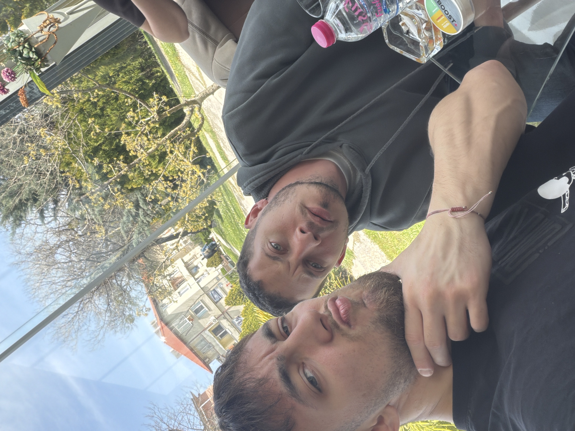 Two men are closely posing for a selfie. The man on top has short, dark hair and is wearing a gray hooded sweatshirt. The man on the bottom has a beard and dark hair and is wearing a black t-shirt. A hand rests on the neck of the bottom man. A bottle of water, a glass, and a Boost bottle are visible on the table. Outside the window, buildings are seen under a partially cloudy sky, along with trees and greenery. The location is the city of Tsarevo, Bulgaria.