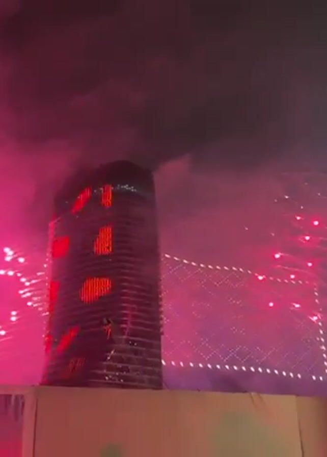 At night, fireworks erupt near a tall building that is lit up with LED lights that cycle through red and blue colors. The building is tall and has a cylindrical shape. The LED lights on the building display different patterns and designs. The fireworks are red and create a lot of smoke. A bridge in the background is also lit with white and blue lights. In the foreground there is a barrier of boards, with the edge of a photograph or illustration peeking out from the bottom left.