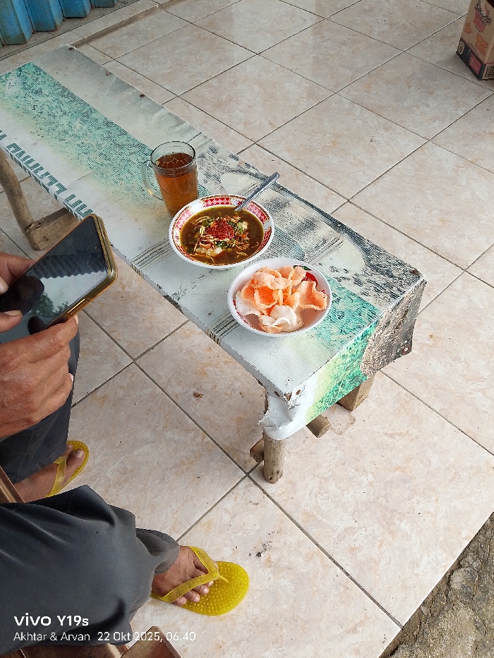 The scene depicts an individual seated at a small, rustic outdoor table in Wanguk, Indonesia, in an overhead, slightly angled perspective. The partially visible person wears dark trousers and bright yellow textured flip-flops, holding a gold-colored smartphone that reflects an overhead structure. On the distressed table, which is constructed from crude wooden supports and covered with a faded green, blue, and white patterned material, rests a clear glass mug of dark amber liquid. Adjacent to it is a white bowl with a red and white checkered rim, containing a dark stew or soup garnished with red spice and green herbs, with a silver spoon submerged. A smaller, matching bowl holds an assortment of light orange and white crackers. The ground is covered with light beige square ceramic tiles. In the background, a light blue corrugated structure is partially visible on the left, and a brown cardboard box labeled "SEL-OP" sits on the floor to the right. A digital watermark "vivo Y19s Akhtan & Arvan 22 Okt 2025, 06:40" is present in the bottom left corner.