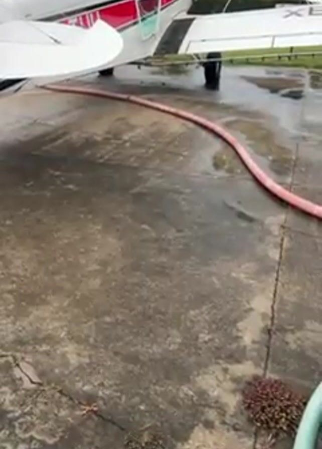 single-engine airplane sitting on a wet concrete surface. A thick, pink hose runs along the ground near the plane's wheels. A green hose is also visible in the foreground. The plane is white with red accents. The tail number, partially obscured, appears to read "XB-TU". The weather seems overcast. The plane's engine is running.