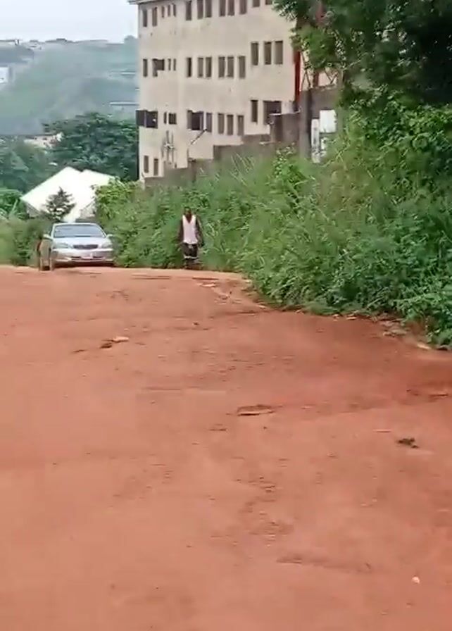 red dirt road in what appears to be a somewhat undeveloped area. There's a large building in the background. A man is walking down the road towards the camera. A child is walking near the car. There is a silver car parked on the road a bit further down from the man and the child. There is some trash, including empty blister packs from medication, discarded on the ground. The overall impression is one of a poor or developing neighborhood.