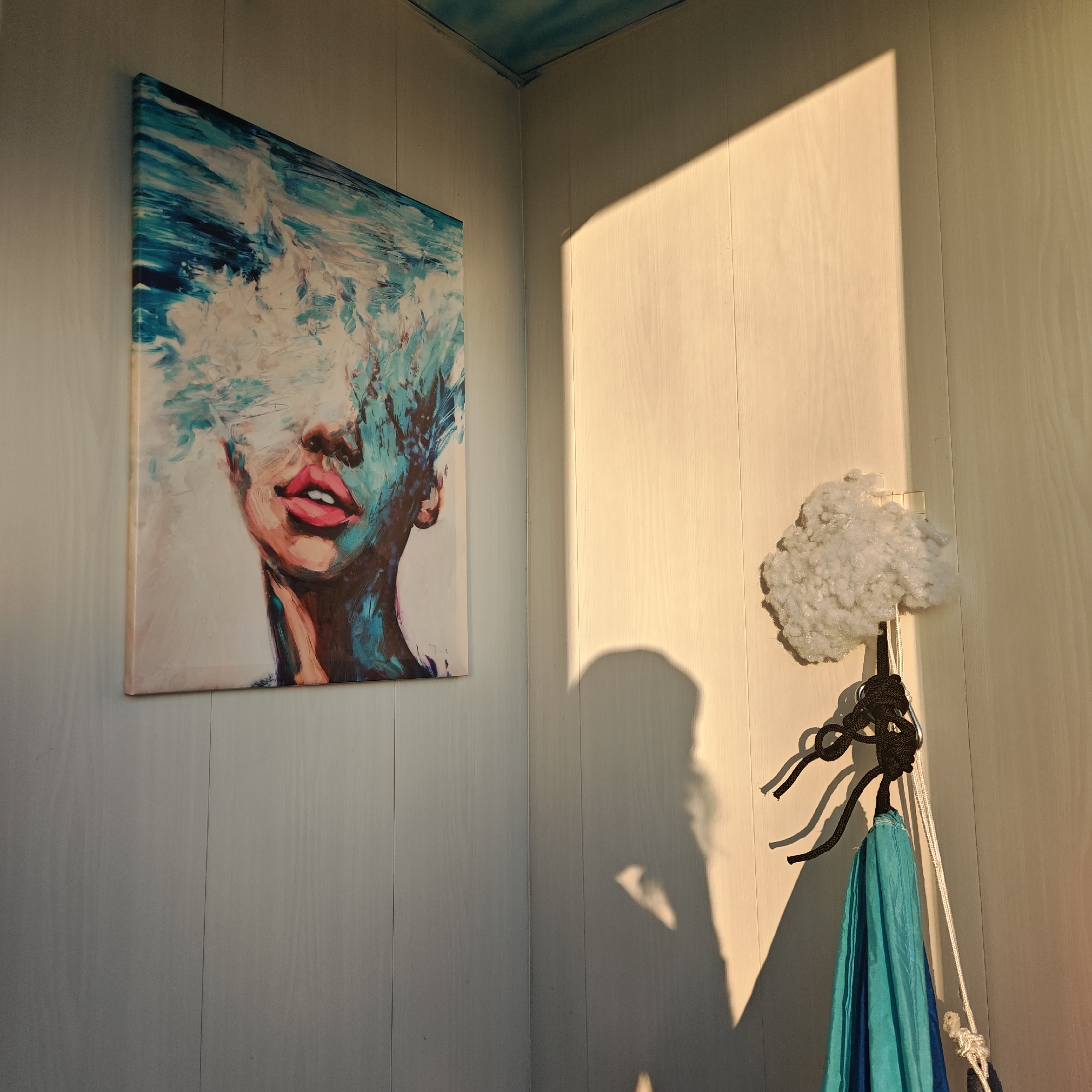 An interior corner of a room, located in Rostov Veliky, Russia, is illuminated by direct, warm-toned sunlight entering from the right. The walls are constructed from vertical light-toned wooden panels. The ceiling in the corner exhibits a light blue and white pattern resembling clouds or water. On the left wall, a rectangular canvas art print is displayed. The artwork depicts a stylized portrait of a female face. The lower half of the face, including the chin, neck, and distinctly pink lips revealing white teeth, is rendered with realistic skin tones. The upper half, encompassing the eyes and forehead, is obscured by abstract, swirling brushstrokes in various shades of blue and white, suggesting a watery or cloud-like effervescence. On the right wall, a white, textured, cloud-like object, possibly made of synthetic fiber, is affixed at mid-height. Suspended directly below it is a section of black rope tied into decorative knots, incorporating a metallic carabiner or ring. Hanging vertically from this rope is a length of blue fabric, folded or gathered, displaying both lighter and darker shades of blue. Strong sunlight casts distinct, elongated shadows on the right wall, including a large triangular shadow originating from the upper right, and a human-like silhouette visible on the lower right portion of the wall.