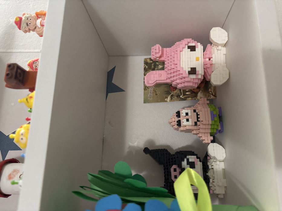 The image displays an interior scene, likely within a residence in Krasny Klyuch, Russia, featuring two white shelves mounted against a light-colored wall. On the upper shelf, visible from below and partially obscured, are several small, colorful figures. From left to right, these include a white object with red markings and green protrusions, two yellow figures with small red pegs, a brown block-like figure, a small pink/red character, and a beige character wearing a red hat and holding a white object. The lower shelf, occupying the majority of the frame, exhibits three figures constructed from small building blocks, arranged from left to right. The leftmost figure is a black and white Kuromi character, seated, with a yellow-green ribbon partially obscuring its left side. Adjacent to it is a standing, light pink Patrick Star character, wearing green shorts with purple trim. To the right, a seated pink My Melody character is visible, featuring a pink hood with prominent ears and a white face and body. Behind the Patrick Star figure, a small rectangular card with the Cyrillic text "С Новым" (Happy New) is visible, depicting a snowy, rustic scene with trees. To the far left of the lower shelf, a blurred arrangement of green paper cutouts resembling leaves or grass, accompanied by a blue flower-like shape and a prominent yellow-green ribbon, partially obscures the Kuromi figure and extends upwards. The walls are light-colored, possibly white or off-white, with several irregular, dark blue star-shaped cutouts or stickers affixed to them, particularly in the corners above the lower shelf and behind the upper shelf. The shelving unit itself is entirely white. Lighting appears even and artificial, typical of an indoor environment. No individuals are present in the scene.