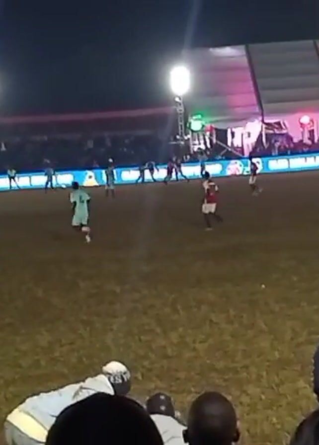 The video depicts a soccer game at night, with floodlights illuminating the field. Players in red and green jerseys are visible on the grass, some running. The view is from behind spectators, whose heads and backs are visible in the foreground. A large tent-like structure is in the background, decorated with lights. An LED screen runs along the side of the field. The atmosphere seems lively, potentially a well-attended event.