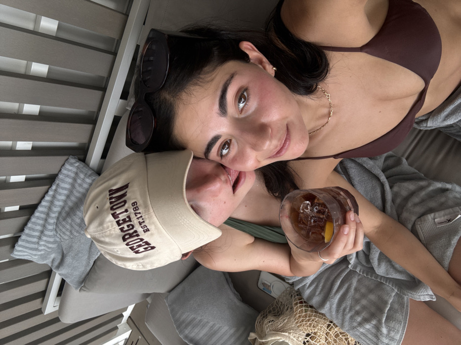 Two females are depicted on an outdoor lounge sofa in Unknown, Bahamas. The individual in the foreground, positioned on the right, has dark hair, wears a dark brown bikini top, a gold chain necklace, and dark sunglasses pushed onto her head; she is looking directly at the camera with a slight smile. The second individual, partially obscured behind the first, wears a beige baseball cap embroidered with "GEORGETOWN EST. 1789" and a green bikini top. Her mouth is open, with lips parted. She holds a clear rocks glass containing a dark liquid, ice cubes, and a lemon wedge in her right hand, which has a silver ring on the fourth finger. Both individuals are partially covered from the waist down by grey towels or blankets. To their left on the sofa, a light-colored woven net bag and a white smartphone are visible. The background features light-colored vertical slats, consistent with an outdoor railing or partition.