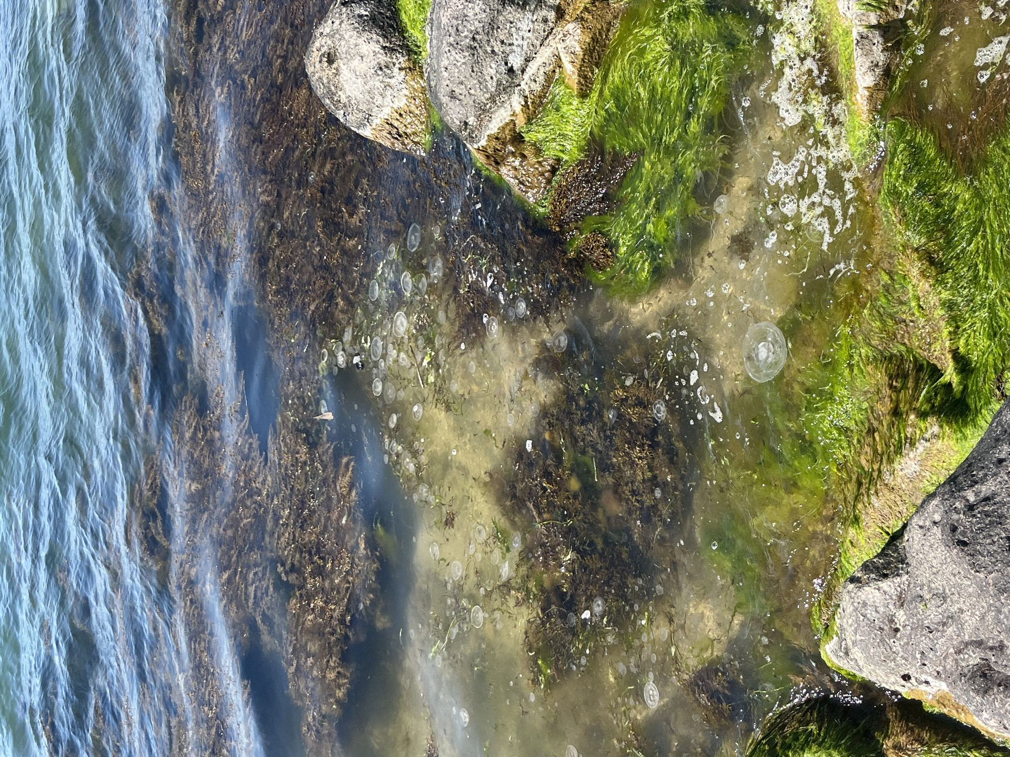 rocky shoreline in Burgas, Bulgaria, where the sea meets the land. The water transitions from deeper, blue-toned waves on the left to shallow, clear water near the shore, revealing submerged vegetation and rocks. The rocks are covered in green algae and moss. Many jellyfish are near the surface of the water near the rocks.