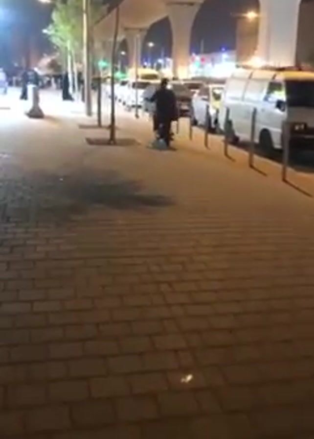 night scene on a brick-paved sidewalk, likely in an urban area. A person on a small moped-like vehicle drives away from the camera. There are parked cars along the side of the sidewalk separated by bollards. Above the sidewalk is an elevated structure, possibly a bridge or train line, supported by large columns. Streetlights illuminate the area. In the distance, people can be seen walking on the sidewalk. There's a shopfront with bright signage on the left side of the frame. The general atmosphere is urban and somewhat busy with both pedestrians and vehicles.