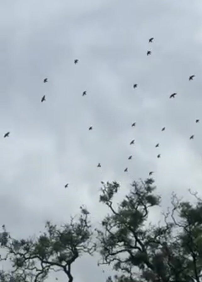 large flock of birds flying in the sky. The sky is overcast, with gray clouds covering the entire frame. Below the sky, there are two trees with dark green leaves, and a building with a white facade and a dark roof. There is also a billboard with text in Spanish that says, "La ciudad más linda del mundo," which translates to "The most beautiful city in the world." The birds are black and appear to be flying in a somewhat organized manner. The video seems to be shot from a low angle, looking up at the sky.