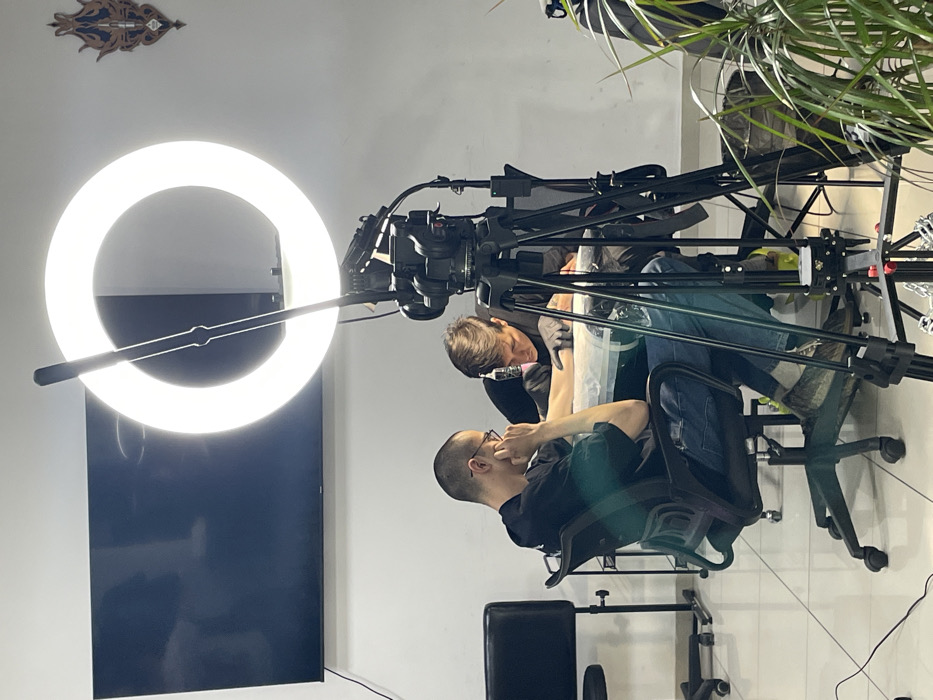 An indoor scene in Rostov-on-Don, Russia, depicts two males engaged in a tattooing session, being filmed