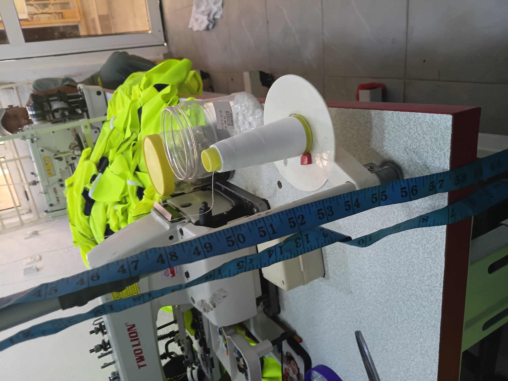 An indoor garment manufacturing workshop is depicted in Lekki, Nigeria. In the foreground, a blue fabric measuring tape, displaying numerical markings from 45 to 60 centimeters, hangs vertically, partially obscuring the scene. To the left, silver-colored scissors rest on a light-colored, speckled countertop that has a dark red-brown edge. A white "TWO LION" industrial sewing machine occupies the left side of the table. To the right of the measuring tape, a large white conical spool of thread with a yellow core is positioned on a white plastic holder, adjacent to a small red rectangular object. Behind this, two clear plastic jars are visible; one has a yellow lid, and the other is open, containing numerous small white buttons. The open jar features a label with text including "SK PLATE PT 7001-00" and "300063820." A substantial pile of bright neon yellow-green fabric items, appearing to be partially assembled garments, is stacked centrally on the table, extending into the mid-ground. In the mid-ground right, a person, wearing a grey long-sleeved shirt, grey trousers, and a light-colored baseball cap, is seated and actively operating an industrial sewing machine, which is partially obscured by the fabric pile. Their hands are engaged with the machine's sewing mechanism. The background features plain white walls and a light grey tiled floor. A white-framed glass door is visible on the far right. An off-white electrical box is situated on the floor beneath the table. A third "TWO LION" industrial sewing machine is faintly visible in the far background, largely obscured by the fabric stack.