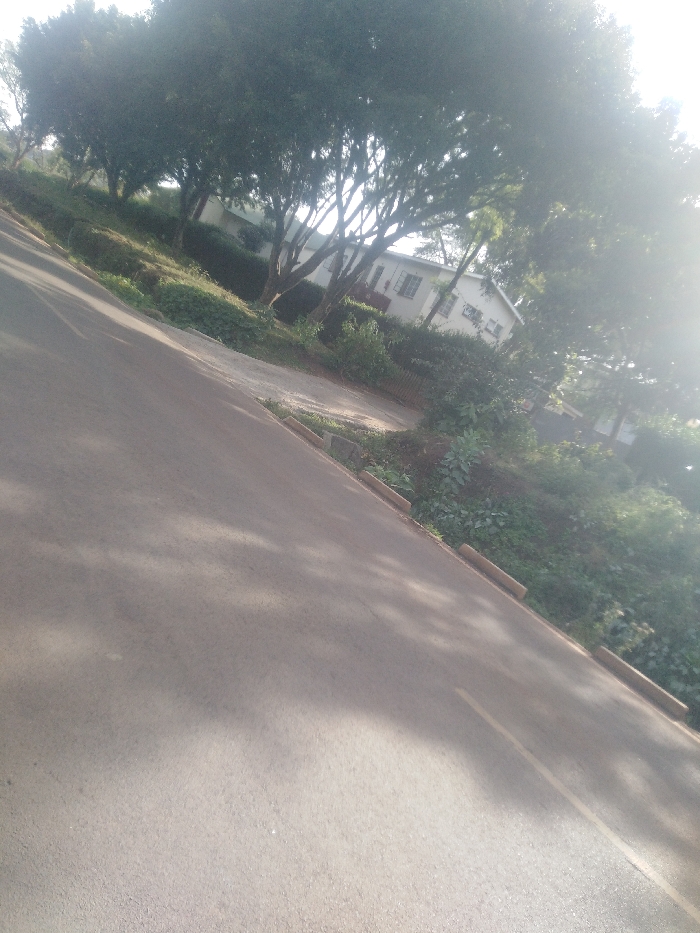 A paved road with a yellow centerline stretches diagonally across the frame, ascending upwards. The road's edges are defined by short, horizontal concrete barriers. Lush greenery and trees flank the roadside, partially obscuring a light-colored, single-story house on a slight incline. Sunlight filters through the foliage, creating dappled shadows on the road surface, enhancing the natural, sunlit outdoor setting.