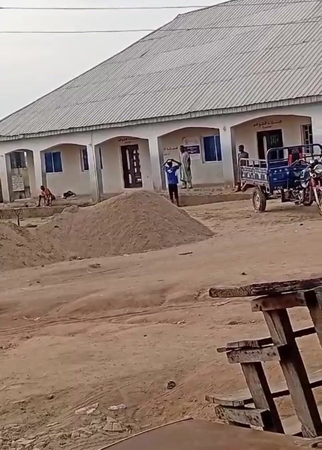 street scene in front of a building with a metal roof and a series of arched windows and doors. A large pile of sand sits in the foreground, and a blue tricycle vehicle is parked nearby. Several people are visible in front of the building, and a person wearing a blue shirt walks by the sand pile. The camera seems to be moving, and at one point, it focuses on clothing belonging to a passerby. The environment appears to be dusty and unpaved.