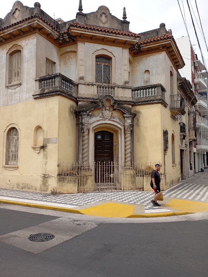 A two-story building with a yellow and beige exterior stands on a street corner. It features a tiled roof, balustrades, and ornate carvings above the entrance. A man walks past the building on a checkerboard-patterned sidewalk with a yellow curb. A sewer drain is visible in the foreground, and other buildings are seen in the background across the street. Utility wires stretch across the sky.
