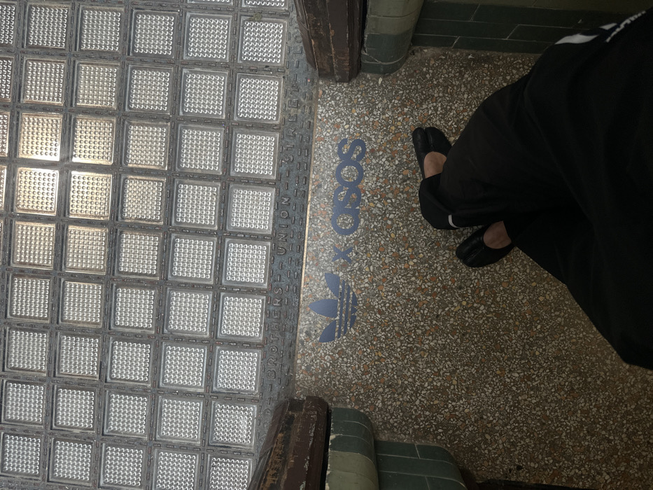 An overhead view depicts a section of pavement and the lower extremities of an individual. The upper half of the image features a grid of approximately 40 clear, textured glass paver blocks set within dark metal frames, illuminating a space below. Directly beneath these blocks, a dark metal strip bears the embossed text "D BROTHERS UNION STREET," which identifies the location as Union Street, specifically referring to the historic pavement lights outside Barton Arcade in Manchester, United Kingdom. Below this metal strip, a speckled terrazzo floor in shades of light brown and beige is visible. On this terrazzo surface, two light blue logos are present: the Adidas trefoil followed by an 'X' and then the ASOS text logo, indicating a brand collaboration. In the lower right quadrant, the lower legs of an individual are positioned. The person wears black trousers, featuring a visible white stripe on the outer seam of the right leg, and black, possibly split-toe (tabi) style or minimalist flat shoes, with bare ankles exposed. The scene is partially framed on the left and right by dark, worn wooden ledges or benches with teal-colored bases.